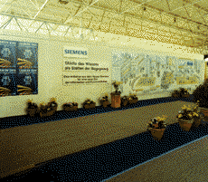 Auf der CeBIT '95 vom 8.-15. März präsentierte die Siemens AG im Rahmen der Ausstellung "Chancen 2000 - Computer, Kommunikation und Umwelt" in Halle 15 Xenia erstmals einer breiteren Öffentlichkeit. Die Reaktionen reichten von Skepsis und Erstaunen ("... hier sind ja gar keine Computer ..."), über Überraschung ("... das hätten wir Siemens nie zugetraut ..."), bis zu Begeisterung, wie die vielen Einträge in "Das Goldene Buch der Stadt Xenia" zeigten. Xenia präsentierte sich den Messebesucherinnen und -besuchern inmitten von Glanz und Elend der Computerwelt als eine ganz neue, andersartige Zukunftsperspektive. In fünf Exponaten stellte sich Xenia, die Wissensstadt auf dem Weg in die Informationsgesellschaft vor. Eine Stadtansicht vermittelte erste Eindrücke von der Geschäftigkeit einer Wissensstadt. Die Entwicklung der Industriegesellschaften bis zur Schwelle zum Informationszeitalter wurde anhand einer viaduktartigen Fassade, die die Kondratieff-Zyklen symboliiserte, dargestellt. Eine Zeichnung eines Ateliers für Innovatoren schaffte die Atmosphähre zur Diskussion und Begegnung am Stand der Wissensstadt. Die Medienwarte, eine tempelartige Fassade zur Darstellung vernetzter Wissenszusammenhänge, vermittelte einen Eindruck vom strukturierten Arbeiten in den Ateliers. Zu Gast bei Xenia war das MedienInstitut Berlin mit einer virtuellen Präsentation von Kulturen des Wissens. Stadtführer und Stadtführerinnen geleiteten die Besucher und Besucherinnen durch die Wissensstadt. Im persönlichen Gespräch, durch Begegnung, entstanden neue Anregungen und Ideen für beide Seiten. Zu Gast waren zahlreiche Persönlichkeiten aus Politik und Wirtschaft, aber auch viele Kinder staunten über die Stadt von morgen, in der sich Lernen erleben läßt. |