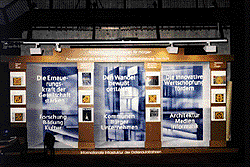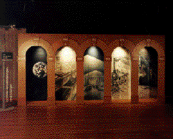 Das Ensemble der Medien - hier in form einer tempelartigen Fassade - ist geeignet, Aussagen in Kontextuellen Bezügen anzuordnen und zu vermitteln. Für Diskussionen läßt sich mit diesem Gestaltungsraum interaktives Arbeiten arrangieren. Die Ausführung kann als Computerprogramm, gegebenenfalls auch kombiniert mit einer baulichen Gestaltung erfolgen. Mit vertrauten Bildern der Architektur lassen sich komplexe, jedoch einfach zu bedienende Benutzungsoberflächen gestalten.