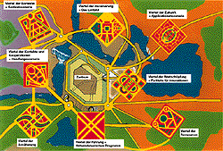 ![]() Stadtpläne Beispiel: XENIA, Wissensstadt am Wege zur Informationsgesellschaft mit neun Stadtvierteln und Hinweisen zur Positionierung von baulichen Ensembles mit differenzierten Nutzungsmöglichkeiten Repräsentation des Prozesses zur Erschließung und Aufbereitung komplexer Innovationen: als Stadt im Haus" im Atelier für Innovatoren" repräsentiert (Arbeitsplattformen) Gestaltungs- und Nutzungspotential: Repräsentation von Prozessen mit Verzweigungen und Simultanitäten, kombiniert mit Nutzungsoptionen |